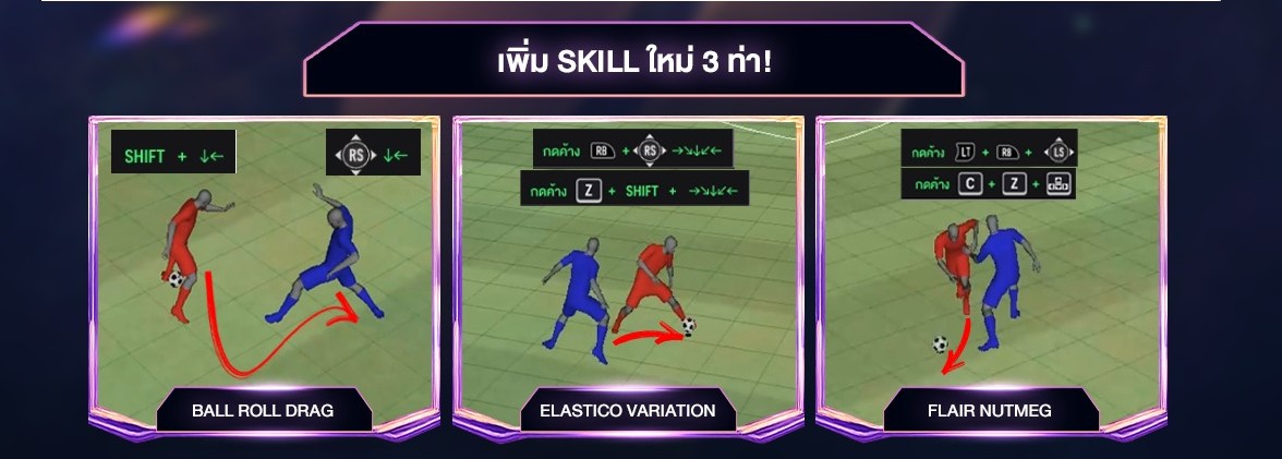 1.Ball Roll Drag (ซ้าย/ขวา) : ลากบอลหลบคู่ต่อสู้แบบเนียนๆ ใช้ได้ทั้งเปิดพื้นที่และหนีเพรส