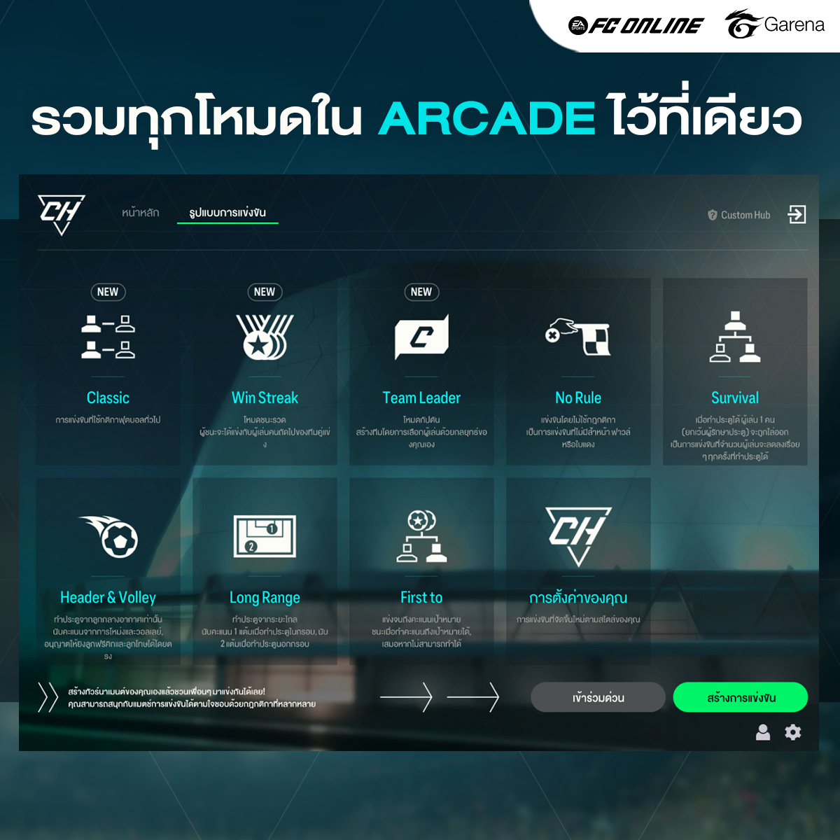 อัปเดตครั้งนี้ FC Online เปิดตัว Custom Hub ระบบใหม่ที่ถูกออกแบบเพื่อรวบรวมทุกโหมด Arcade และโหมดการแข่งขันแบบสร้างเองไว้ในที่เดียว ช่วยให้ผู้เล่นสามารถเลือกโหมด เข้าเล่น หรือสร้างห้องแข่งได้อย่างรวดเร็วและชัดเจนกว่าเดิมแบบเห็นผลทันที
