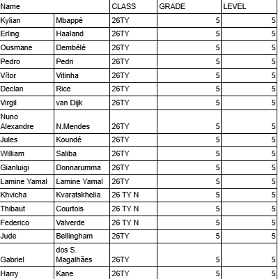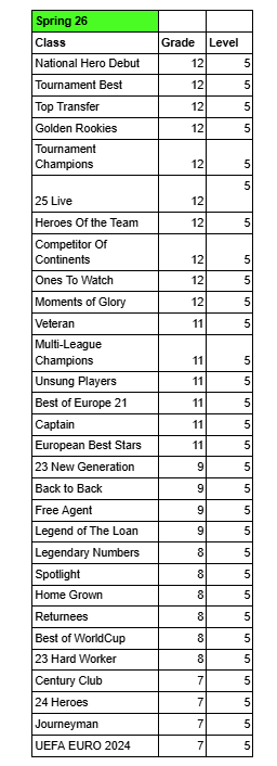 ในการแข่งขันรอบ League, Semi-Final และ Final คลาสนักเตะที่สามารถใช้ในการแข่งได้ และ ระดับของแต่ละคลาส ดังนี้